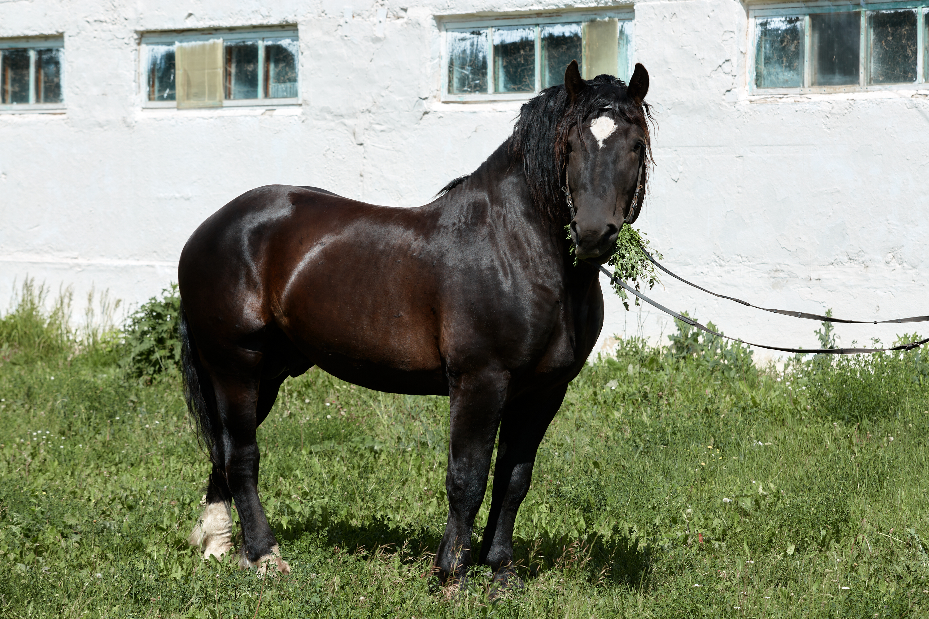 А у Егеря есть какие-то привилегии теперь? К нему теперь особый подход, царский?! – спрашивали мы всех, кто ухаживает за чемпионом. И все нам отвечали: «Нет, здесь все гуляют, питаются и работают одинаково! Какие привилегии? Чем больше лошадь, тем больше нужна ей нагрузка, тем она шире, мускулистее и рельефнее становится. Поэтому все рабочие и спортивные нагрузки у Егеря такие же, как у других жеребцов. И навоз он в телеге наравне со всеми вывозит! Чем больше тяжеловоз работает и нагружается - тем лучше у него здоровье и настроение! Радует, что тренинг и моцион лошадей с приходом компании «АГАТ» ведётся строго по графику с аттестацией по периодам».