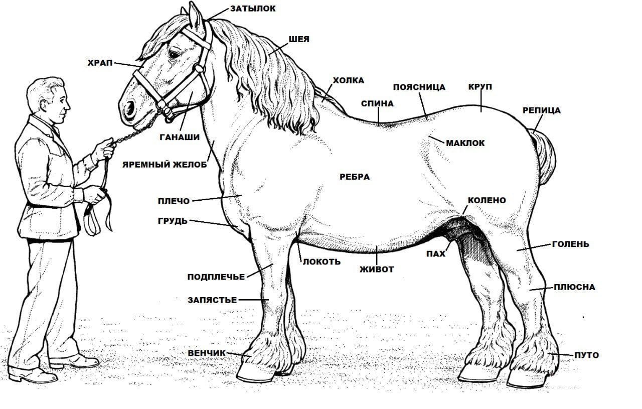 Такие рисунки Даниил разместил на двери ветеринарного кабинета: уж где-где, а на конном заводе все просто обязаны знать анатомическое строение лошади. Здесь щеки лошади называют ганашами, нос — храпом, знают, где у лошади локоть, круп и репица. Что и говорить, профессионализм начинается с основ, с базовых элементов.