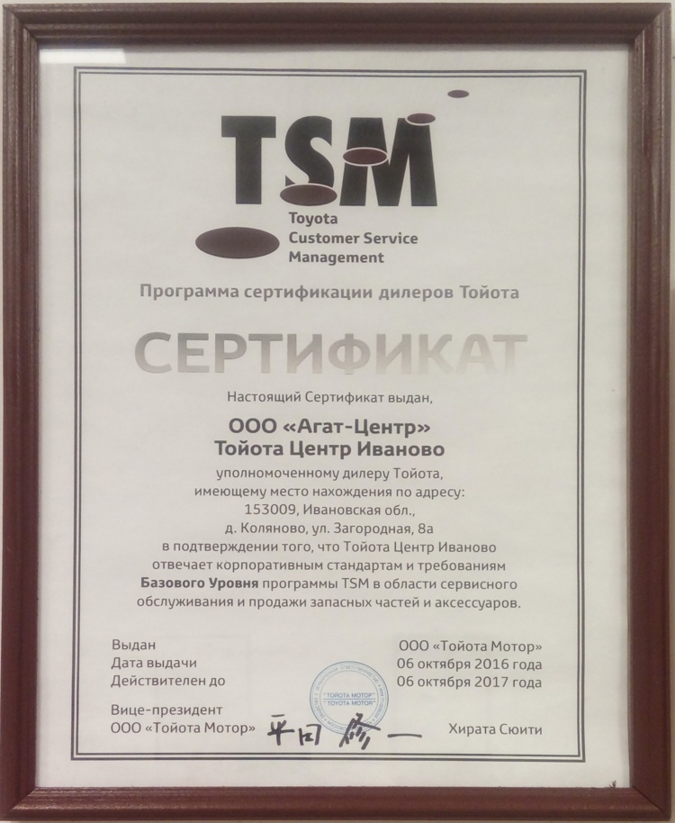 Осенью Тойота Центр Иваново повторно защитил статус дилерского центра по программе Тойота Сервис Менеджмент (TСM) в области сервисного обслуживания и продажи запасных частей и аксессуаров.