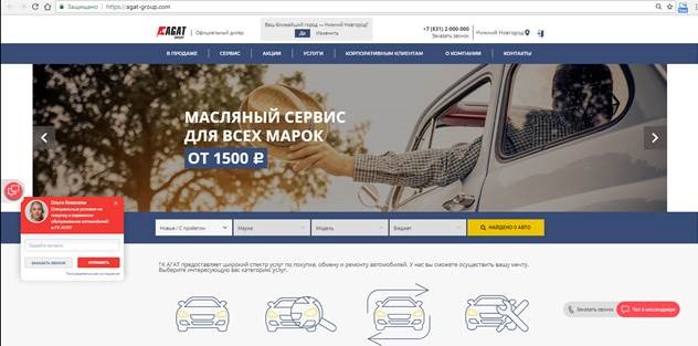 Основной продукт компании – автомобили – вынесен на центральное поле.  Посетитель может выбрать новый автомобиль или авто с пробегом из имеющихся на складе, а также оставить заявку на выбранную позицию.